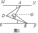 (3)根据平行线的性质得到∠1=∠ADH,∠2=∠BDH,∠NAC=∠ACG,∠FBC=∠BCG,根据平行线的定义得到∠1=$\frac{1}{2}∠$MAC,∠2=$\frac{1}{2}$∠CBF,根据四边形的内角和和角的和差即可得到结论.