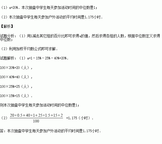 的值,并求出本次抽查中学生每天参加户外活动时间的中位数;