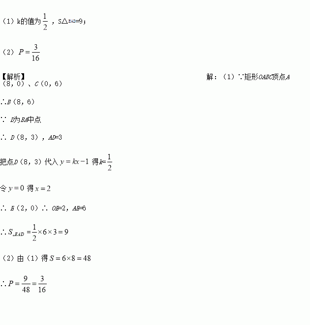 如图,矩形OABC顶点A(8,0)、C(0,6),直线y=kx-1分别交BA、OA于点D、E,且D为BA中点。