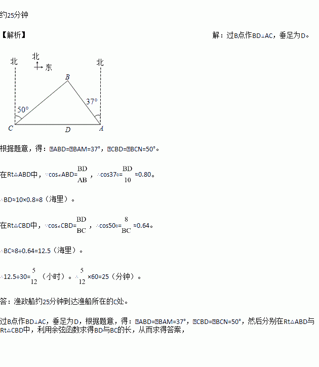 南中国海是中国固有领海,我渔政船经常在此海域执勤巡察.一天我渔政船停在小岛A北偏西37°方向的B处,观察A岛周边海域.据测算,渔政船距A岛的距离AB长为10海里.此时位于A岛正西方向C处的我渔船遭到某国军舰的袭扰,船长发现在其北偏东50°的方向上有我方渔政船,便发出紧急求救信号.渔政船接警后,立即沿BC航线以每小时30海里的速度前往救助,问渔政船大约需多少分钟能到达渔船所在的C处?