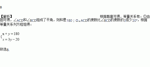 如图,点C在直线AB上,∠ACD的度数比∠BCD的度数的3倍少20°,设∠ACD和∠BCD的度数分别为x、y,那么下面可以求出这两个角的度数的方程组是( )