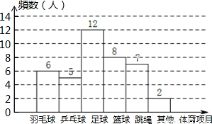 最喜欢的体育项目是什么?”的问题进行了调查,每位同学都选择了其中的一项,现把所得的数据绘制成频数分布直方图(如下图),据图中的信息可知,该班学生最喜欢足球的频率是( )![]()