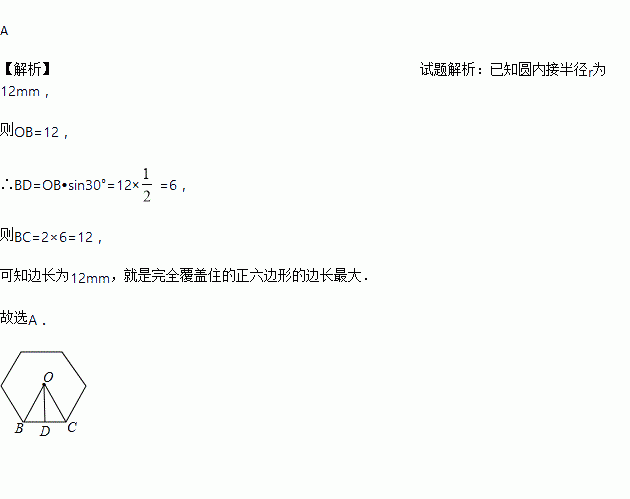 一元钱硬币的直径约为24mm,则用它能完全覆盖住的正六边形的边长最大不能超过( )
