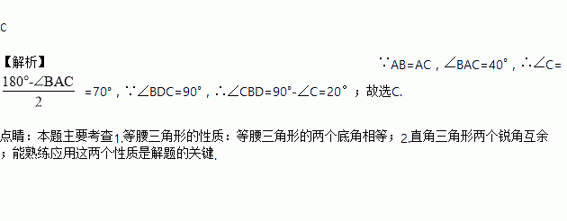 在△ABC中,AB=AC,BD为△ABC的高,如果∠BAC=40°,则∠CBD的度数是( )