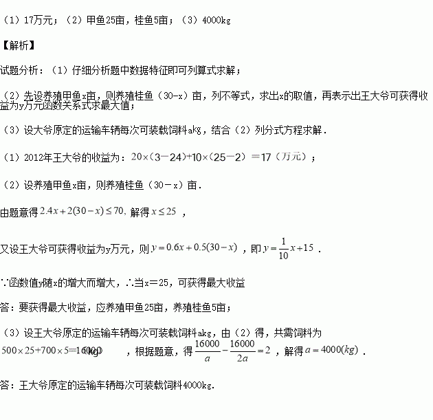 (3)已知甲鱼每亩需要饲料500kg,桂鱼每亩需要饲料700kg.根据(2)中的养殖亩数,为了节约运输成本,实际使用的运输车辆每次装载饲料的总量是原计划每次装载总量的2倍,结果运输养殖所需全部饲料比原计划减少了2次.求王大爷原定的运输车辆每次可装载饲料多少kg?
