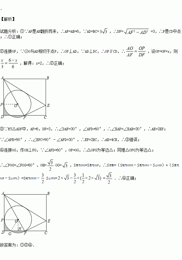 如图,矩形ABCD中,E是BC上一点,连接AE,将矩形沿AE翻折,使点B落在CD边F处,连接AF,在AF上取点O,以O为圆心,OF长为半径作⊙O与AD相切于点P.若AB=6,BC=