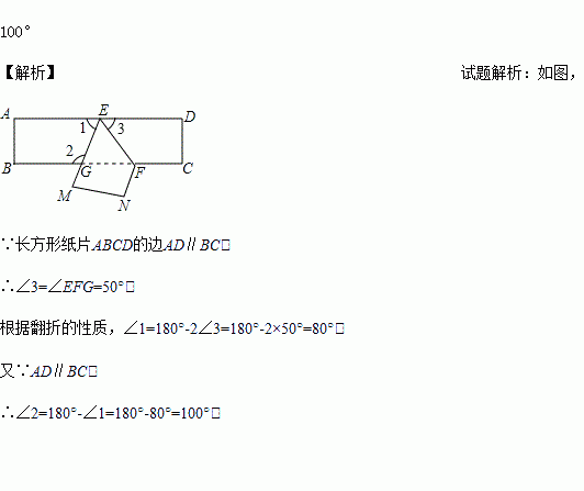 如图,把一张长方形纸片ABCD沿EF折叠后ED与BC的交点为G,D、C分别在M 、N的位置上,若∠EFG=50°,则∠2=_________.