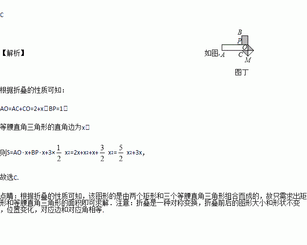 生活中有人喜欢把请人传送的便条折成图丁形状,折叠过程如图所示(阴影部分表示纸条反面),如果折成图丁形状的纸条宽 x cm, 并且一端超出P点1 cm,另一端超出P点2 cm,那么折成的图丁所示的平面图形的面积为 cm2. ( )