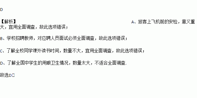 C. 了解全校学生的课外读书时间 D. 了解全国中学生的用眼卫生情况