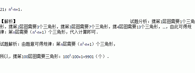 如图所示是用三角形摆成的图案,摆第一层图需要1个三角形,摆第二层图需要3个三角形.摆第三层图需要7个三角形,摆第四层图需要13个三角形,摆第五层图需要____个三角形…摆第n层图需要______个三角形.