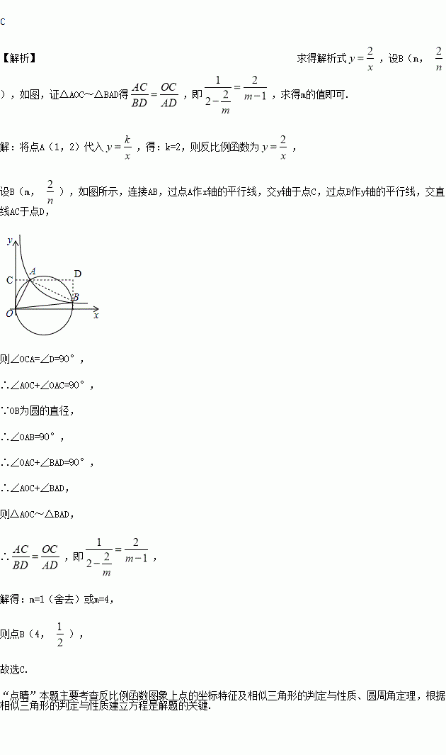 上,B为反比例函数图象上一点,不与A重合,当以OB为直径的圆经过A点,点B的坐标为( )