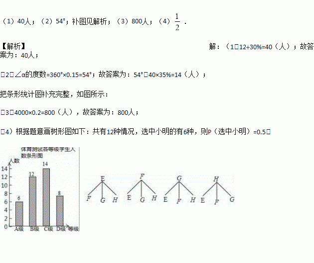 (4)测试老师想从4位同学(分别记为E、F、G、H,其中E为小明)中随机选择两位同学了解平时训练情况,请用列表或画树状图的方法求出选中小明的概率.