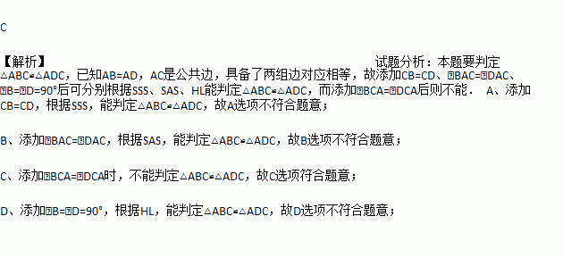 如图,已知AB=AD,那添加下列一个条件后,仍无法判定△ABC≌△ADC的是 ( )