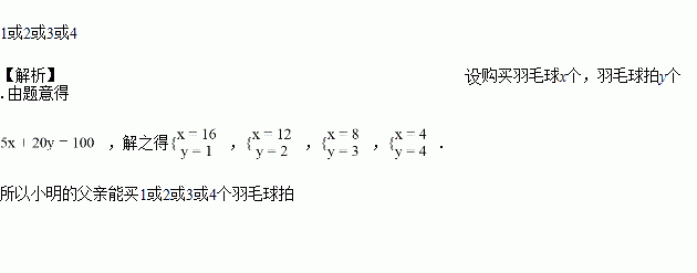 小明父亲正好用100元钱为小明的班级购买羽毛球和羽毛球拍(两种都买),羽毛球每个5元,羽毛球拍每个20元,那么小明的父亲能买____________个羽毛球拍。
