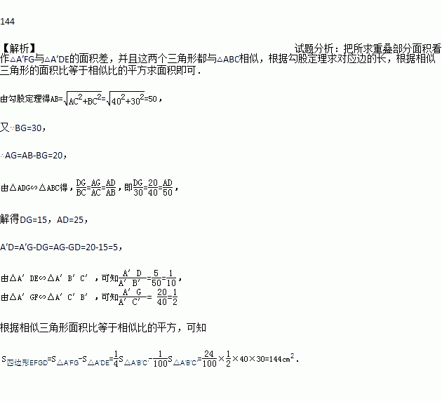 如图,三角板ABC的两直角边AC,BC的长分别是40cm和30cm,点G在斜边AB上,且BG=30cm,将这个三角板以G为中心按逆时针旋转90°,至△A′B′C′的位置,那么旋转后两个三角板重叠部分(四边形EFGD)的面积为 cm2.![]()