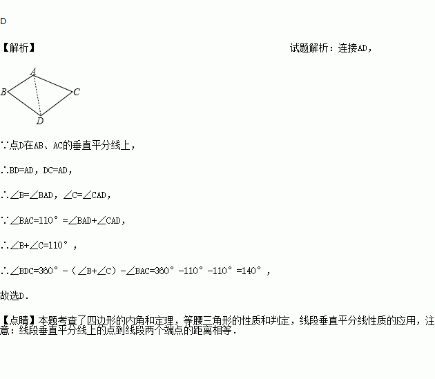 如图,四边形ABCD,∠A=110°,若点D在AB、AC的垂直平分线上,则∠BDC为( )