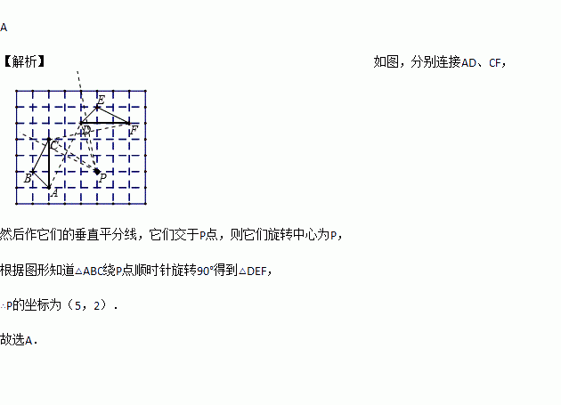 如图,在方格纸上△DEF是由△ABC绕定点P顺时针旋转得到的.如果用(2,1)表示方格纸上A点的位置,(1,2)表示B点的位置,那么点P的位置为( )