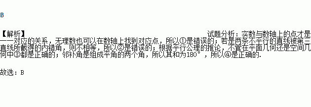 下列命题中:①.有理数和数轴上的点一一对应;②.内错角相等;③.平行于同一条直线的两条直线互相平行;④.邻补角一定互补.其中真命题的个数是( )