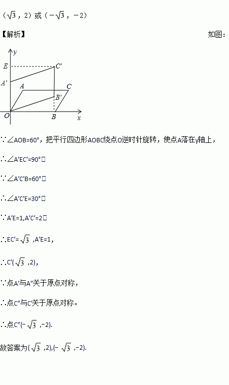 平行四边形AOBC在平面直角坐标系中的位置如图所示,∠AOB=600,AO=1,AC=2, 把平行四边形AOBC绕点O逆时针旋转,使点A落在y轴上,则旋转后点C的对应点C′的坐标为_____________.