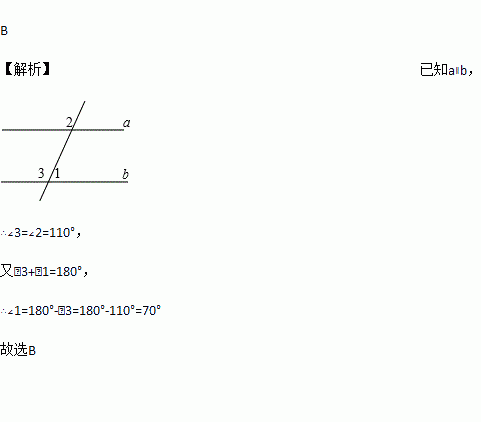 如图,装修工人向墙上钉木条,若∠2=110°,要使木条b与a平行,则∠1的度数等于( )