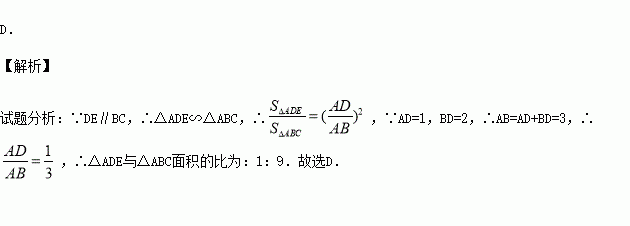 如图,在△ABC中,DE∥BC,分别交AB,AC于点D,E.若AD=1,DB=2,则△ADE的面积与△ABC的面积的比等于( )