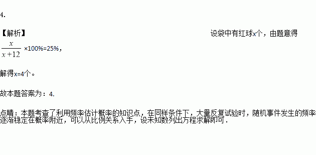 在一个不透明的口袋中,装有12个黄球和若干个红球,这些球除颜色外没有其他区别.小李通过多次摸球试验后发现,从中随机摸出一个红球的频率稳定在25%,则该口袋中红球的个数可能是__ .