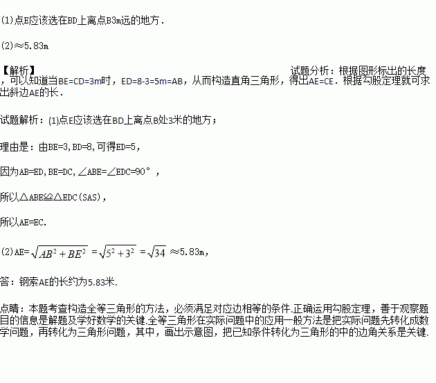 有两根电线杆AB,CD,AB=5m,CD=3m,它们的底部相距8m.现在要在两根电线杆底端之间(线段BD上)选一点E,由E分别向两根电线杆顶端拉钢索AE,CE.