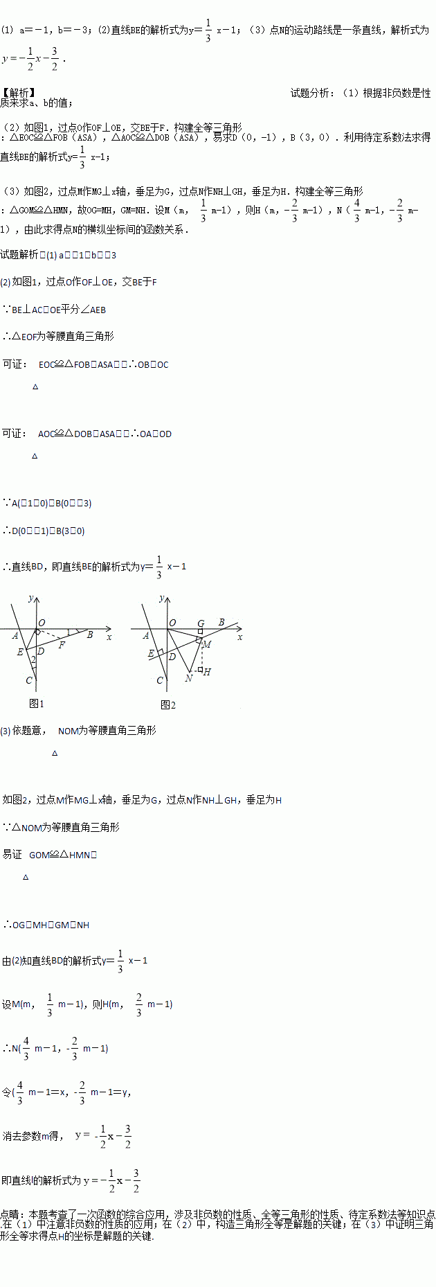 (2) 点B为x轴正半轴上一点,如图1,BE⊥AC于点E,交y轴于点D,连接OE,若OE平分∠AEB,求直线BE的解析式;