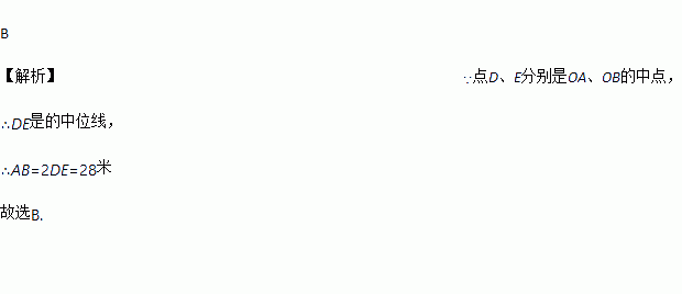 如图,为测量池塘边A、B两点的距离,小明在池塘的一侧选取一点O,测得OA、OB的中点分别是点D、E,且DE=14米,则A、B间的距离是(  )