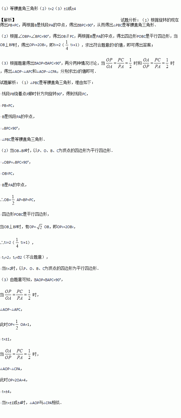 如图,在平面直角坐标系中,点A的坐标为(0,2),点P(t,0)在x轴上,B是线段PA的中点.将线段PB绕着点P顺时针方向旋转90°,得到线段PC,连结OB、BC.