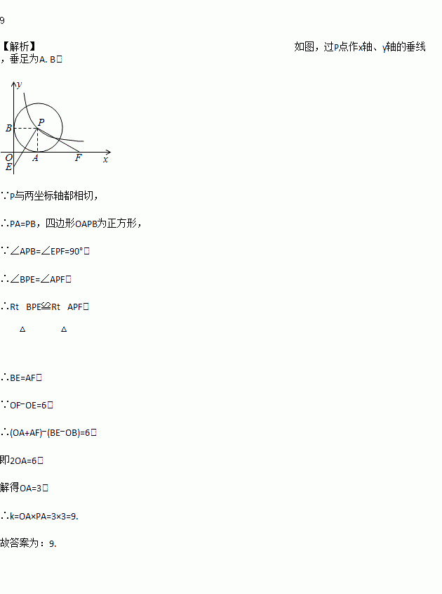 (x>0)上,⊙P与两坐标轴都相切,点E为y轴负半轴上的一点,过点P作PF⊥PE交x轴于点F,若OF-OE=6,则k的值是____.