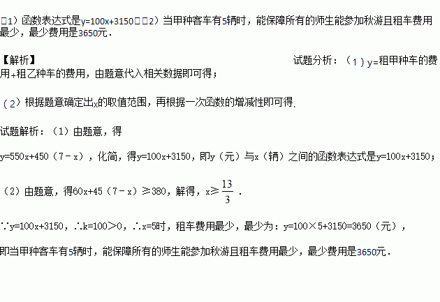 (1)设租用甲种客车x辆,租车总费用为y元.求出y(元)与x(辆)之间的函数表达式;