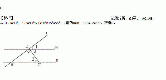 如图,m∥n,直线l分别交m,n于点A,点B,AC⊥AB,AC交直线n于点C,若∠1=35°,则∠2等于( )
