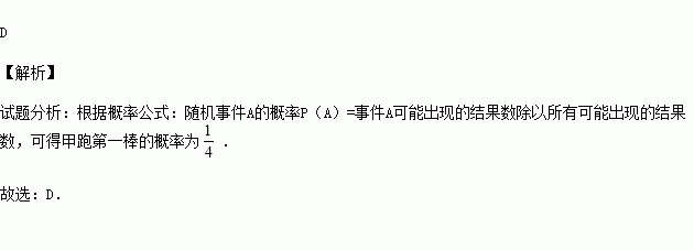 接力赛时,安排了甲,乙,丙,丁四位选手,他们的顺序由抽签随机决定,则甲跑第一棒的概率为( )