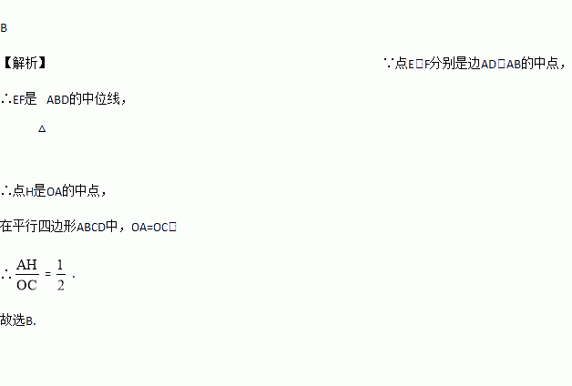 如图,在平行四边形ABCD中,对角线AC,BD相交于点O,点E,F分别是边AD,AB的中点,EF交AC于点H,则