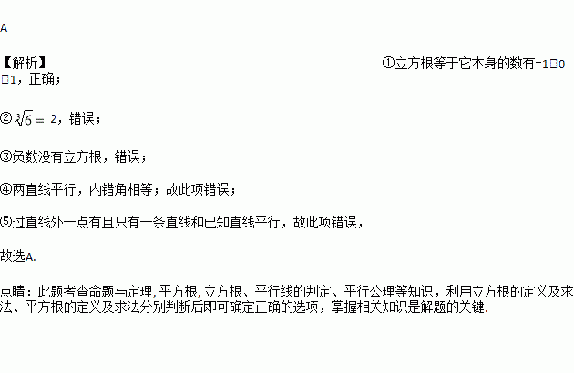 ;③负数没有立方根;④内错角相等;⑤过一点有且只有一条直线和已知直线平行.正确的有( )