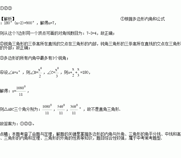 以下四个命题:①一个多边形的内角和为900°,从这个多边形同一个顶点可画的对角线有4条;②三角形的三条高所在的直线的交点可能在三角形的内部或外部;③多边形的所有内角中最多有3个锐角;④△ABC中,若∠A=2∠B=3∠C,则△ABC为直角三角形.其中真命题的是_______________.(填序号)