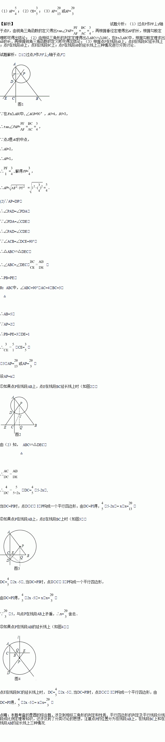 如图,在Rt△ABC中,∠ACB=90°,AC=4,BC=3,P是射线AB上的一个动点,以点P为圆心,PA为半径的⊙P与射线AC的另一个交点为D,直线PD交直线BC于点E.