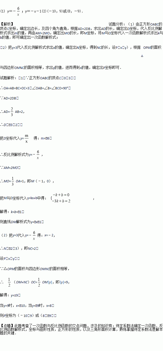 如图,在平面直角坐标系中,正方形OABC的顶点O与坐标原点重合,点C的坐标为(0,3),点A在x轴的负半轴上,点D、M分别在边AB、OA上,且AD=2DB,AM=2MO,一次函数y=kx+b的图象过点D和M,反比例函数y=