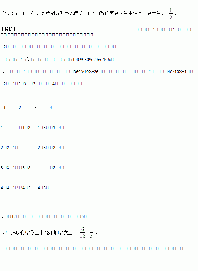 (2)在自选项目为“投掷实心球”的学生中,只有1名女生.为了了解学生的训练效果,将从自选项目为“投掷实心球”的学生中,随机抽取2名学生进行投掷实心球训练测试,请用树状图或列表法求所抽取的2名学生中恰好有1名女生的概率.
