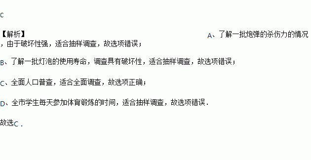C. 全面人口普查 D. 全市学生每天参加体育锻炼的时间