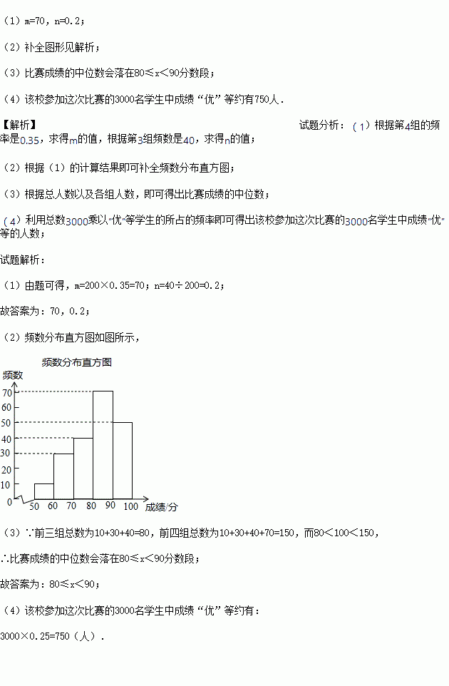 (4)若成绩在90分以上(包括90分)的为“优”等,则该校参加这次比赛的3000名学生中成绩“优”等约有多少人?