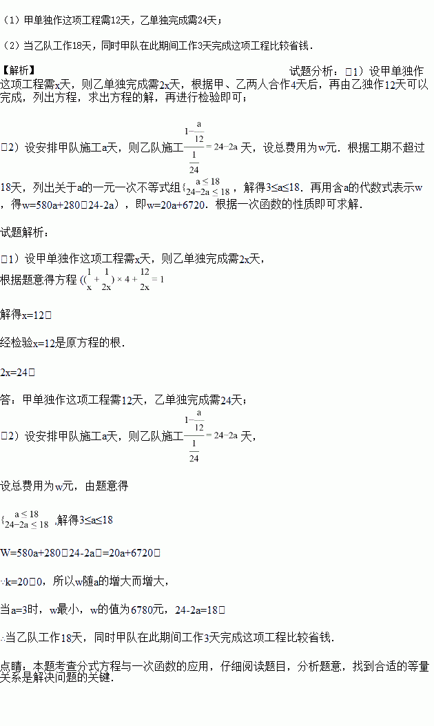 某装修工程,甲、乙两人可以合作完成,若甲、乙合作4天后,再由乙独做12天可以完成,已知甲单独做每天需要费用580元,乙独做每天需要280元,但乙单独完成的天数是甲单独完成的天数的2倍。