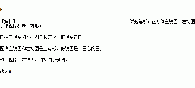 如图,下列四个几何体中,它们各自的三视图(主视图、左视图、俯视图)有两个相同,而另一个不同的几何体是( )