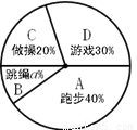某校在一次大课间活动中,采用了四钟活动形式:A、跑步,B、跳绳,C、做操,D、游戏.全校学生都选择了一种形式参与活动,小杰对同学们选用的活动形式进行了随机抽样调查,根据调查统计结果,绘制了不完整的统计图.