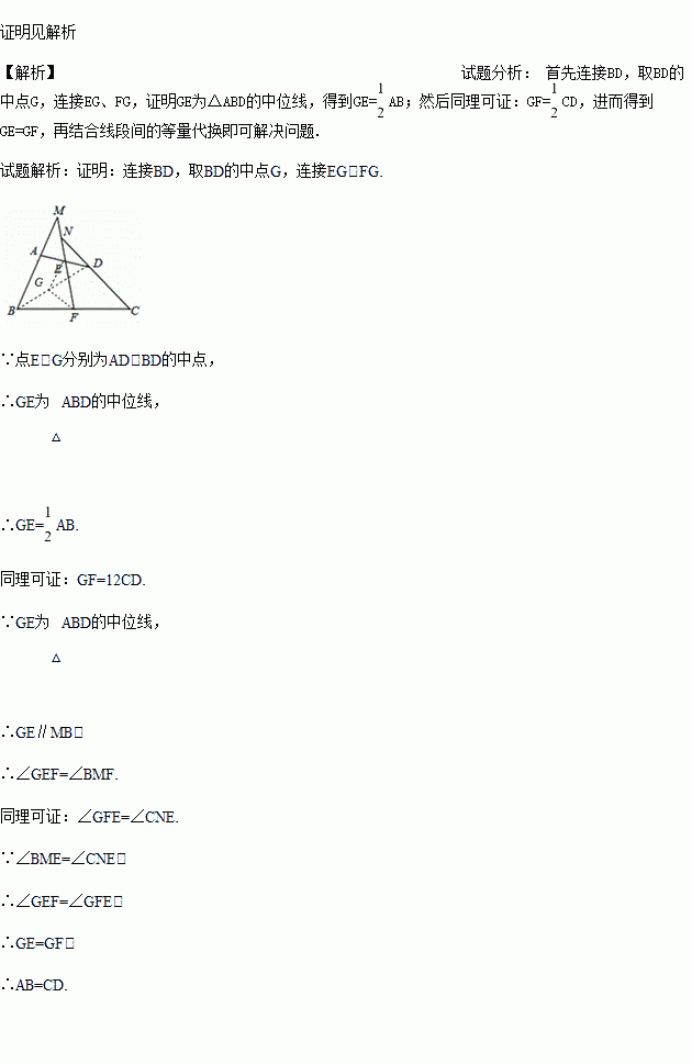 如图,在四边形ABCD中,E、F分别是AD、BC的中点,连接FE并延长,分别交CD的延长线于点M、N,∠BME=∠CNE,求证:AB=CD.