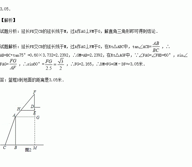 如图1,2分别是某款篮球架的实物图与示意图,已知底座BC=0.60米,底座BC与支架AC所成的角∠ACB=75°,支架AF的长为2.50米,篮板顶端F点到篮框D的距离FD=1.35米,篮板底部支架HE与支架AF所成的角∠FHE=60°,求篮框D到地面的距离(精确到0.01米)(参考数据:cos75°≈0.2588,sin75°≈0.9659,tan75°≈3.732,