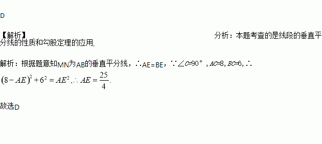 AB长为半径作弧,两弧分别交于M,N两点,过M,N两点的直线交AC于点E,若AC=8,BC=6,则AE的长为: