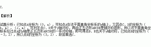 如图,正五边形ABCDE放入某平面直角坐标系后,若顶点A,B,C,D的坐标分别是(0,a),(﹣3,2),(b,m),(c,m),则点E的坐标是( )
