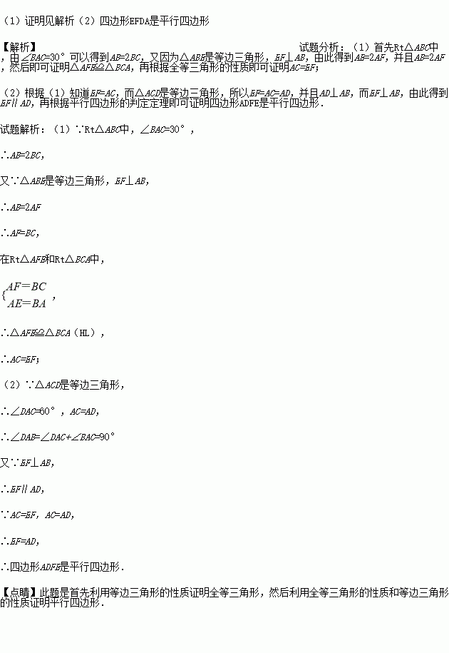 如图,分别以Rt△ABC的直角边AC及斜边AB向外作等边△ACD及等边△ABE,已知∠ABC=60°,EF⊥AB,垂足为F,连接DF.